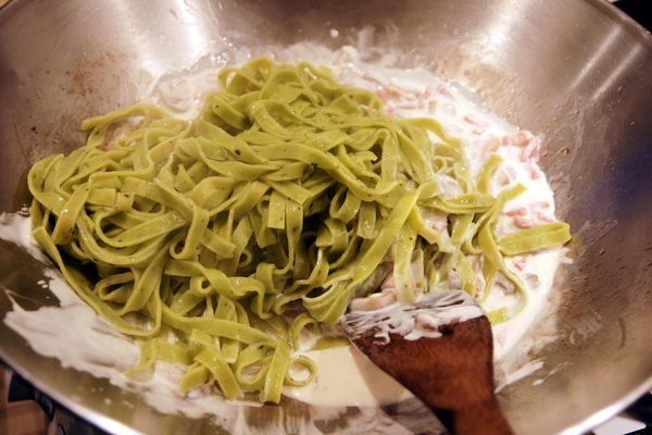 6. 將煮熟的麵去水後,全部倒入大鍋中和所有食材一起攪和。