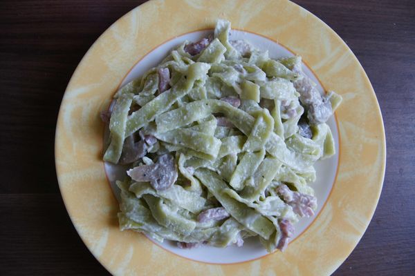 剛來法國前幾年,回台灣時家人有時會問我在法國平時都吃什麼?我回:「吃麵吧!就愛湯湯水水的熱食。」但小胖不喜歡我煮的熱湯,理由是沒什麼味道。於是他建議一道超簡單麵食:法式奶油培根蛋麵 (Tagliatelles carbonara à la française)。小胖說:「法式兩個字很重要,因為義式做法不同。」沒想到我對這款沒有湯的麵居然一試成主顧!小胖每次去家樂福買菜也會買此料理的相關食材,所以平均兩、三個禮拜就會吃一次法式奶油培根蛋麵。下班回來如果真的不知道要吃什麼,至少可以快速端出一道讓兩人吃了都會好滿足的十分鐘料理。