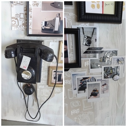 這個作品已經立體太超過了喔!連電話都能架上來,那麼跳蚤市場的二手打字機也不是不無可能了!淡褐色底面配上金色大小不同相框及其他黑色元素(電話、相框、黑白照、黑底白字條)緩緩地帶出雅致氛圍。如法文標題所說,主題是個人收藏 (Collection personnelle) 。透過這片大木板,作者匯集收藏的復古相機一覽無遺。