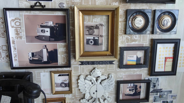 上圖右上角用兩個復古大徽章技巧性地平衡了整個構圖,一點都不突兀。幾個相框裡雖未放相機照片,但拍立得底片及日期標籤也是圍繞在相片這個大主題。