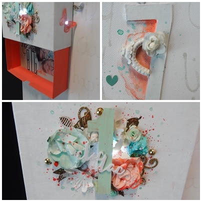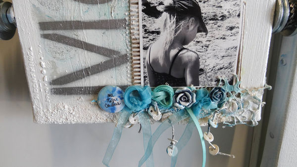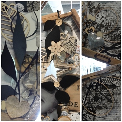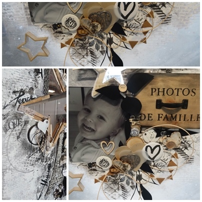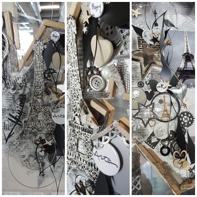 作品有兩面。其中一面是以艾菲爾鐵塔為主題,除了 A4大小的鐵塔照及噴漆後的大型鐵塔造型的木片 (花費不少喔!) 外,作者也很巧妙的運用和鐵有關的元素,如齒輪、鐵線、鐵網等來呼籲主題。融合中性柔和的其他木頭配件讓整個作品不會那麼陽剛。各試大小徽章和鈕扣也大量地使用在作品上。黑色紙剪裁的愛心和葉子散發出黑色的低調氛圍,剛好可以和背景的白色噴漆相呼應。