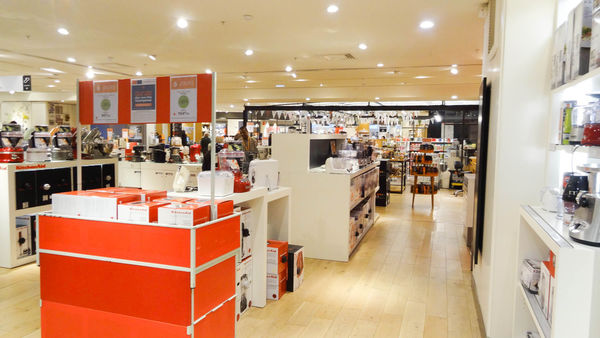 一到廚具樓層看到 Beka 廚具和其他品牌都在打六折,我當下的反應就是想起媽媽的叮嚀:「如果剛好有看到特價幫我買一下…。」也在小胖耳邊叮嚀:「 媽媽的母親節禮物就是要不銹鋼平底鍋。」看到折扣時兩人當下興奮不已,不過三秒後馬上確認一下原價 。折扣固然吸引人,但如果原價硬是高於其他通路兩成以上,那這一切也只是個隱藏的騙局!確認應該不是個騙局後,兩人決定先去賣場逛一圈,看看有沒有其他我們也有興趣的廚房用品。策略是先輕鬆地逛,再去拿笨重的鍋子。這樣一來就不用推著一堆鍋子叮叮咚咚的逛整圈。現場存貨還有很多且非假日整個百貨人很少,所以不急 。之前周末來的時候都不是這樣的。你看看你看看,說有多空就有多空。此為排隊結帳時站的角度的取景: