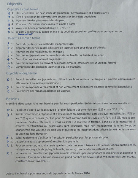 條件刪一刪,我居然只在網上找到兩個適合的家教,價位介於25到30歐。我因此有個巴黎日文家教不好找的結論。光是最後一項「週末能來我家上課」接受的老師就不多了。幸運地,很快就和氣質十足日本味的Yuko老師聯絡上 (人家本來就是道地的日本人!), 雙方敲定了一週後開始第一堂課。 見面之前我還列了短、中、長期學習目標及六大需求/建議給老師參考,足足填滿一張A4。希望沒有嚇到老師,我其實很和善的 (閉眼點頭中…)。