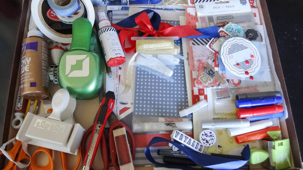 下圖盒蓋裡的工具素材們這就是我這頁相編可以使用的傢伙。想用的全聚集在一起省去了東找西找的時間能讓相編做得更有效率。不然老實說如果花半天才做一頁相編,我有時候會蠻火的!一頁做半天 那我那上千張的相片何時能做完?