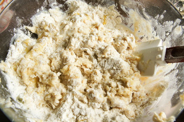 2/ 將上述液體到入加糖和鹽的麵粉內,攪和搓柔約幾分鐘。