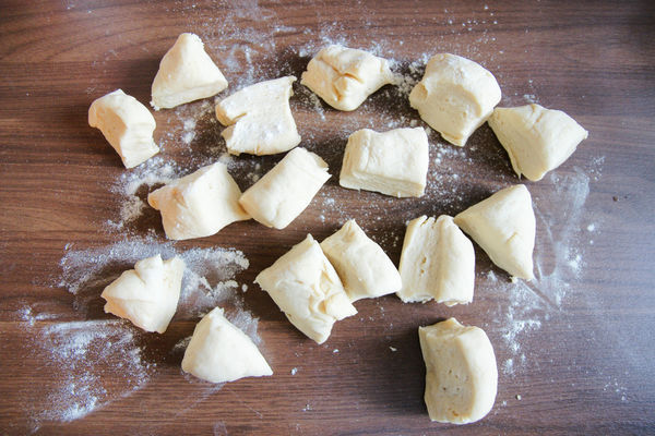 將麵團桿成為長條後切半,再切半,再切半,再切半。共切16塊。