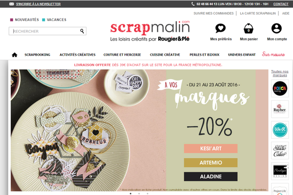 Scrapmalin算是我法國網上相編血拚的供應始祖。雖然標題有scrap字樣,但其實網上賣的不只scrap 商品,各式手作材料如串珠、裁縫都可以在這找到。也有特別開小孩專區喔。今夏上網採購時,頓時覺得畫面怪怪的,但沒有想太多先血拚再說。血拚完才發現怎麼網頁多了 Rougier&Plé 字樣。之前網站的色系是紫白色,而現在是紅黑,整個頁面變得較低調多了。