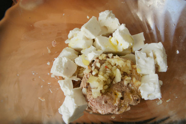 3. 拿出一個沙拉盆,將菲達起司、蒜頭、鮪魚通通到進去,加點橄欖油和胡椒 。