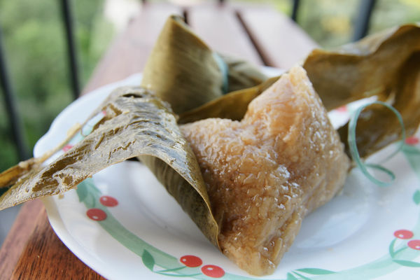 原本也考慮要不要來個甜的,但知道有棗子就當場直接out。進餐廳後原本只想先買兩顆粽子試試看。但直覺反應還是詢問店家一下粽子大小,店家表示當正餐一個人可吃二到三個。當下決定買四個,一人兩個就當兩人當晚的晚餐。拿到實體粽後,果真有一個吃不飽的感覺,還好買了四個。到家後趕快拆粽: