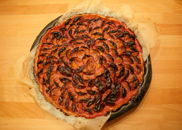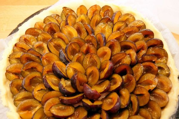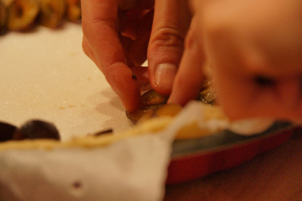 李子排滿整個塔皮,塞到不能再塞。李子多的是,小胖吩咐排滿點,不要有空隙。