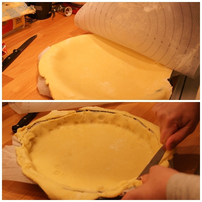 將多餘的餅皮切掉。多餘的餅皮除了可以拿來做小塔外,也可冷凍先冷凍起來。累積幾球退冰後可以再撖一個塔餅。