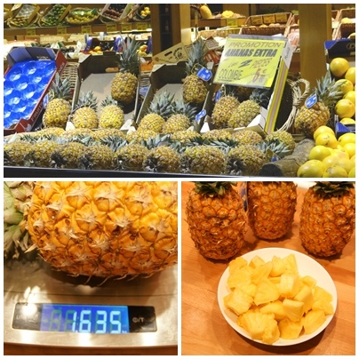 就是因為許久未吃到鳳梨,幾年前在市集看到有從非洲卡麥隆空運來的鳳梨,即便知道最好吃在地食物及減少空運、船運的能源消耗,還是買了。買的當下對標價上的每公斤標價沒什麼概念。秤完重量報價時我愣了一下,一顆將近十歐。和台灣產季時一顆50元新台差很大。這讓我這個從海島台灣來的鳳梨控情何以堪?!回家趕快切開來吃,邊切還對鳳梨說:「 你最好給我有甜,不然我揍你喔!」 吃下的第一口,哇…好甜,但也好貴。哎!即便是秤重賣,鳳梨去完皮後基本上就自動減重三分之二,和榴槤一樣虛有其表。但就是因為思念那甜滋味,甘心被它騙下去啦!之後偶爾我也會任性一下要小胖買一顆給我嚐嚐。