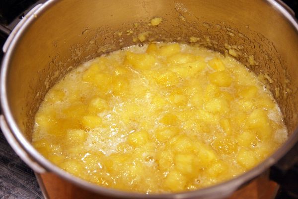 將鳳梨切小塊,中間的心可以用調理機攪碎加糖。加冰糖、麥芽、檸檬皮、檸檬水。如有香草莢會加一根一起煮。不能加水,中小火煮到濃稠為止即可。一斤鳳梨約加 200-300 克糖。糖多比較不壞,鳳梨醬也不要煮太多。因為沒有放防劑腐,也是會壞的。