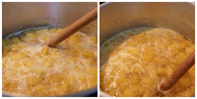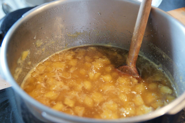 不停地攪拌鳳梨醬,三不五時撈出表層的白色泡沫。訣竅就是慢火煮,過猶不及。