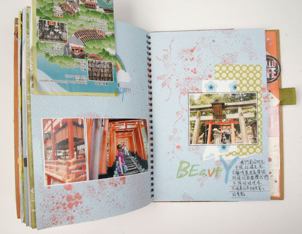 最後還是決定都到了這,只在山下照相,回巴黎後一定會有遺憾。所以兩人當場定案,登!這頁背景搭配模板噴了點桃紅漆映襯紅色的鳥居。上山的途中遇到不少遊客,所以只要眼前一沒有人就趕快照相留戀。