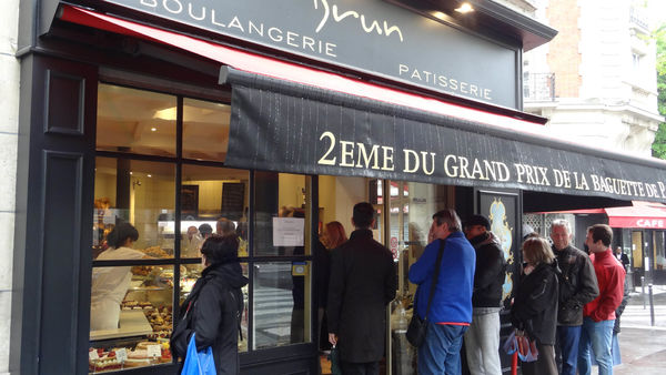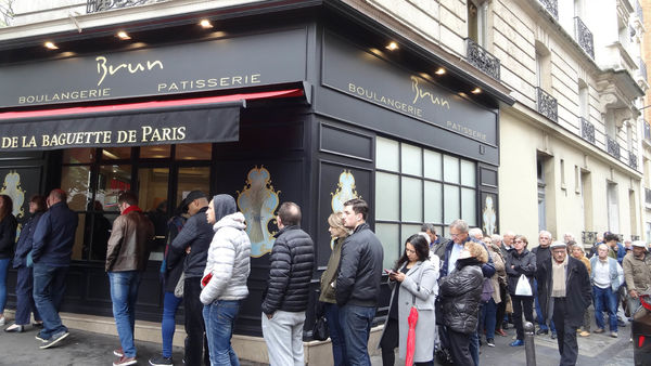 無意間在網路上看到家裡附近有一家巴黎2017年第一名棍子麵包的麵包店。二話不說和小胖法國總統第二輪投票完就直接散步去麵包店瞧個究竟。快接近麵包店時,遠遠看就看到排隊人潮。應該就是這家了,排隊都排到外頭。這個第一名頭銜除了讓50歲的店家Sami Bouattour得到四千歐元獎金,這家麵包店也成為法國總統府為期一年的供應商。