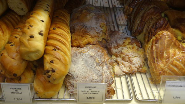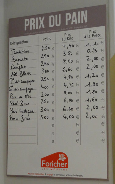 在排隊時可以順便看一下先店門口的價目表。價位最高的居然是吐司,一公斤九歐,不便宜。其他的榖麥類麵包價錢反倒都算親民。第一名的棍子麵包,一公斤3.8歐,一條95分,連一歐都不用。這讓我想到兩年前和小胖在台北信義區買到的一條60元但拿起來會下垂的棍子麵包。讓我們哭笑不得。畢竟主食不同,性價比也不同。巴黎餐廳的一碗白飯2歐以上,也是坑。
